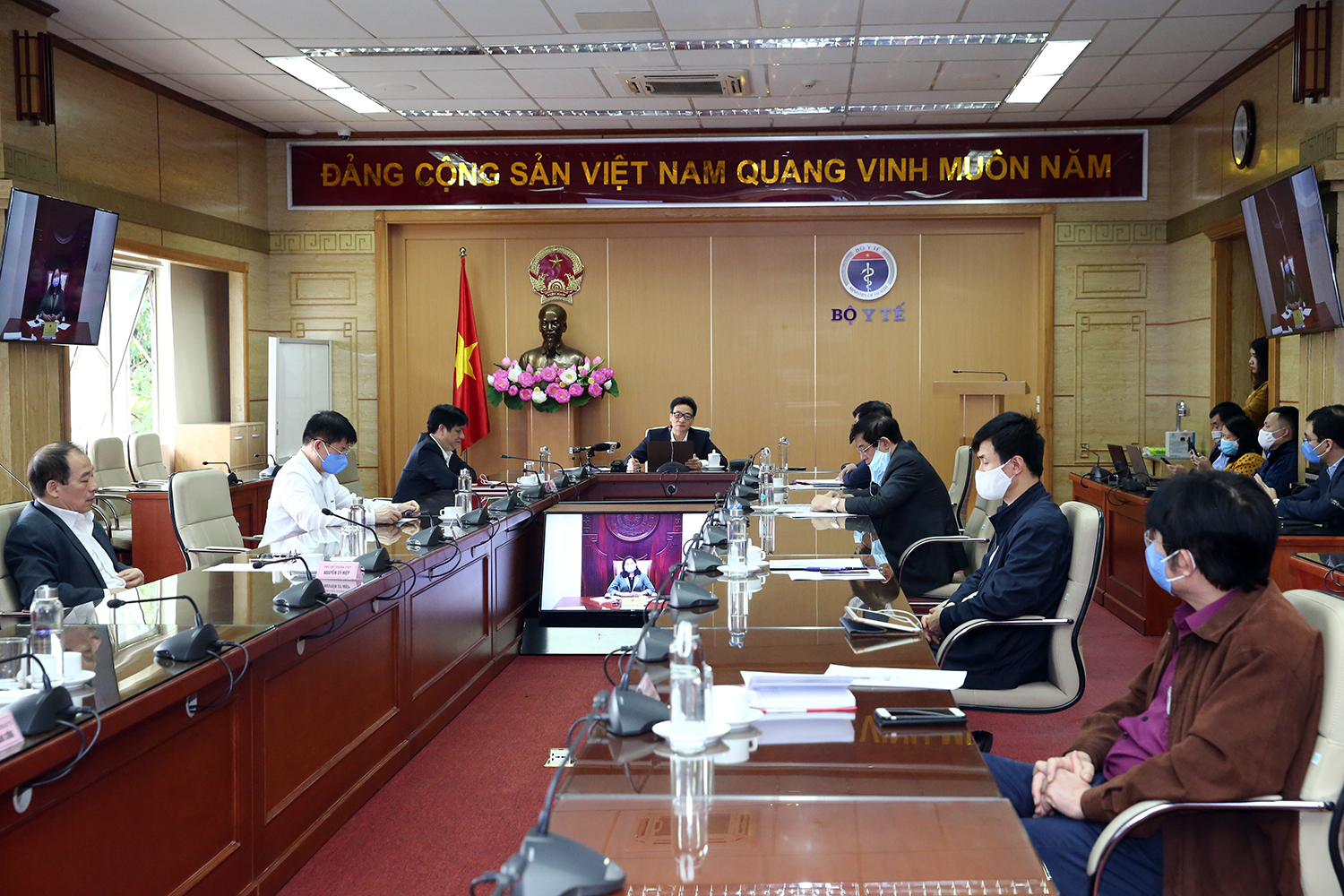 Các thành viên tham gia cuộc họp trực tuyến phòng chống dịch COVID-19 tại điểm cầu Bộ Y tế. Ảnh: Đình Nam
