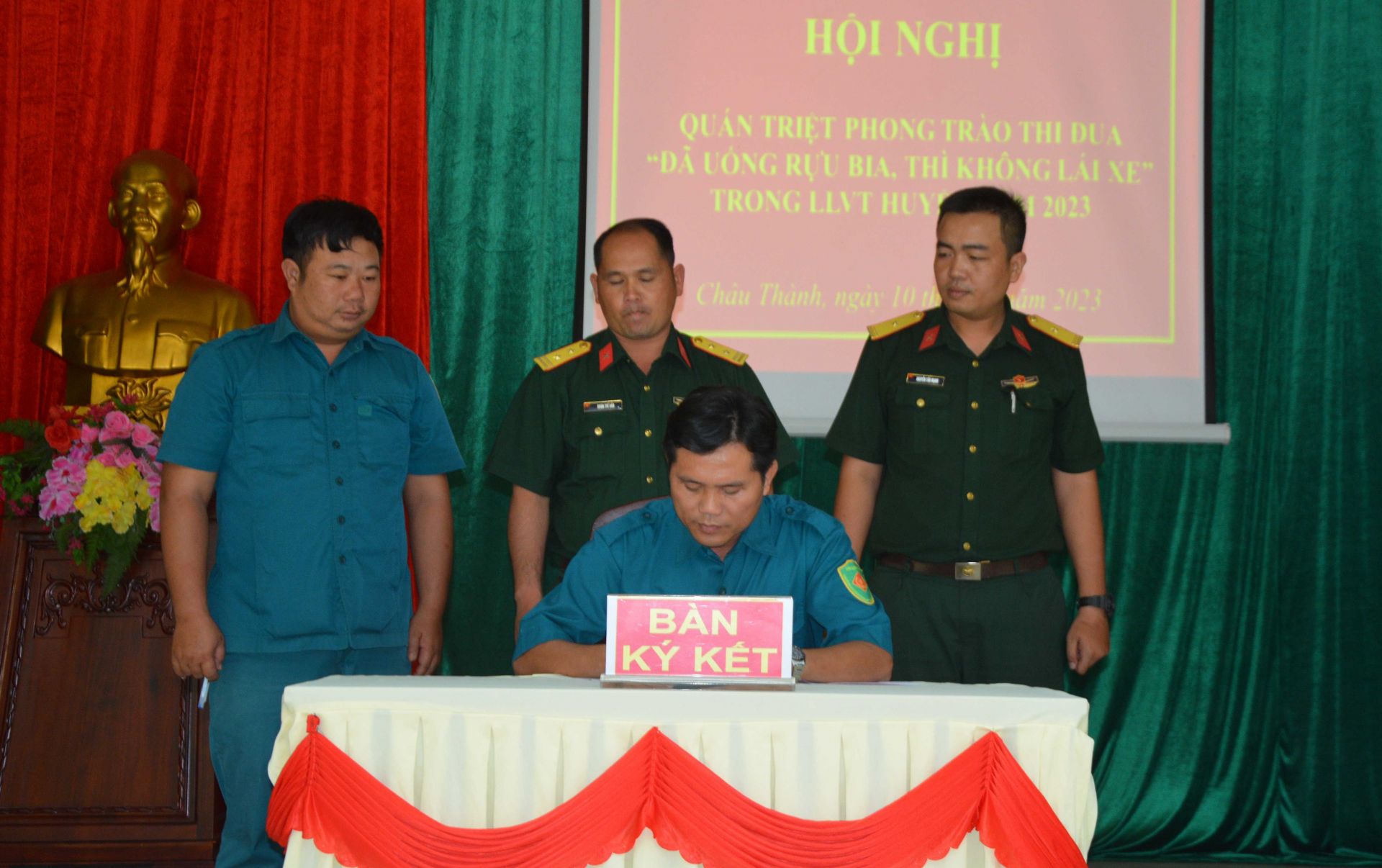 Sáng 11.8, Ban CHQS huyện Châu Thành quán triệt nội dung phong trào thi đua bảo đảm an toàn giao thông với chủ đề: LLVT huyện thi đua thực hiện văn hóa giao thông “Đã uống rượu, bia thì không lái xe”.