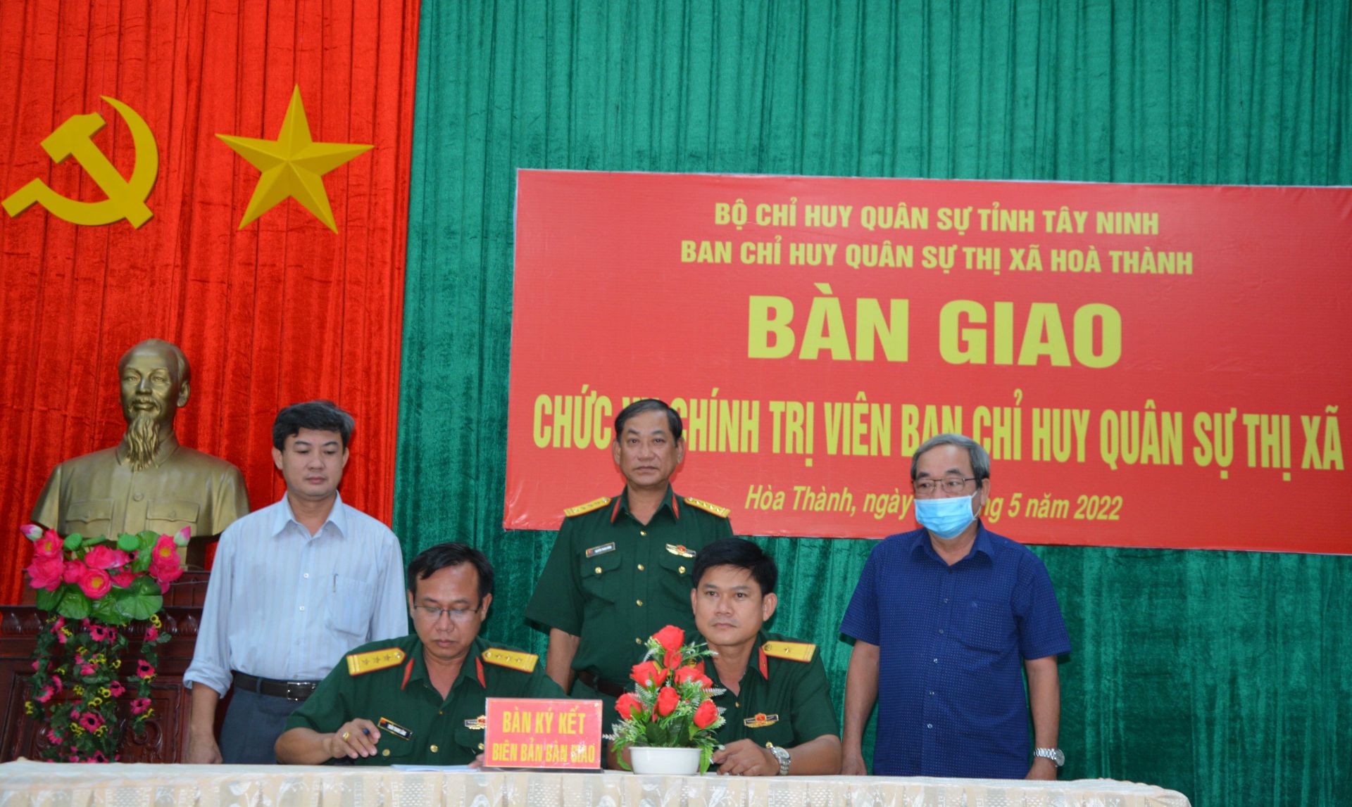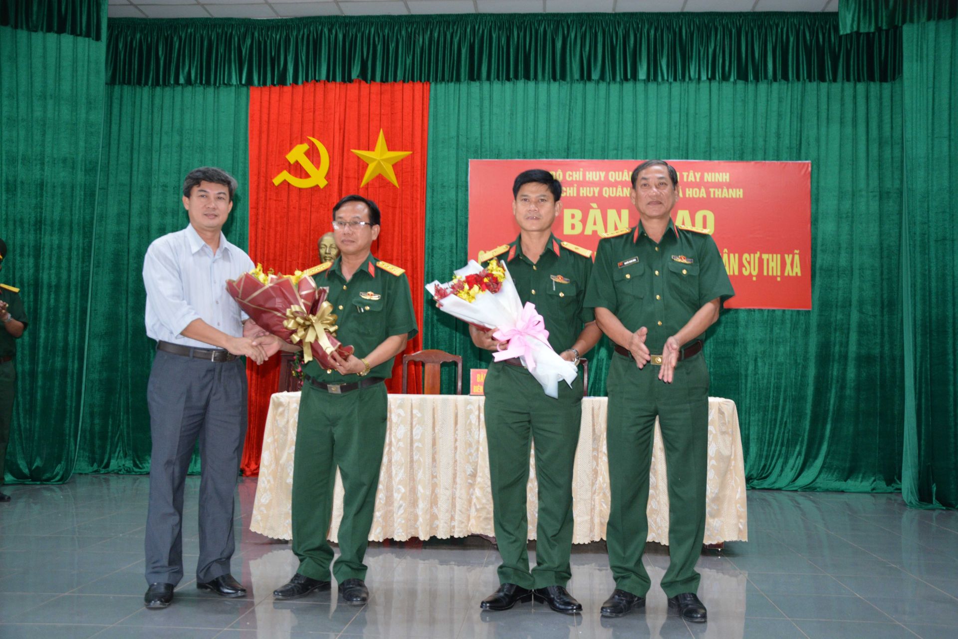 Thủ trưởng Bộ CHQS tỉnh, lãnh đạo thị xã Hoà Thành tặng hoa chúc mừng hai cán bộ nhận nhiệm vụ mới.