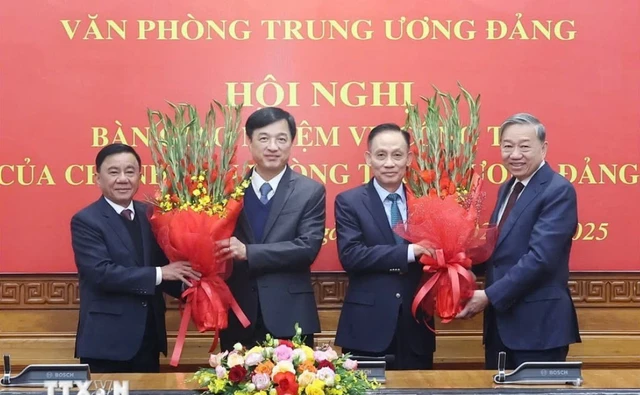 Tổng Bí thư Tô Lâm và Thường trực Ban Bí thư Trần Cẩm Tú tặng hoa chúc mừng ông Nguyễn Duy Ngọc (thứ hai từ trái qua), Uỷ viên Bộ Chính trị, Bí thư Trung ương Đảng, Chủ nhiệm Ủy ban Kiểm tra Trung ương, nguyên Chánh Văn phòng Trung ương Đảng và ông Lê Hoài Trung (thứ hai từ phải qua), Bí thư Trung ương Đảng, Chánh Văn phòng Trung ương Đảng. Ảnh: TTXVN