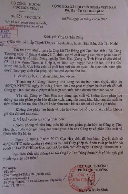Trong Công văn số 805, ngày 18.7 của Cục Hoá chất (Bộ Công Thương) gửi cho Công ty Tinh Hoa có nêu: Thực hiện chỉ đạo của lãnh đạo Bộ Công Thương về việc giải quyết đơn khiếu nại của ông Lê Tấn Ðông, ngày 26.4.2017, về chất lượng sản phẩm phân bón vô cơ do Công ty Tinh Hoa sản xuất; ngày 30.6.2017, tổ công tác của Cục Hoá chất đã phối hợp với Cục QLTT và Sở Công Thương tỉnh Long An tổ chức kiểm tra xác minh điều kiện sản xuất, kinh doanh đối với Công ty Tinh Hoa.