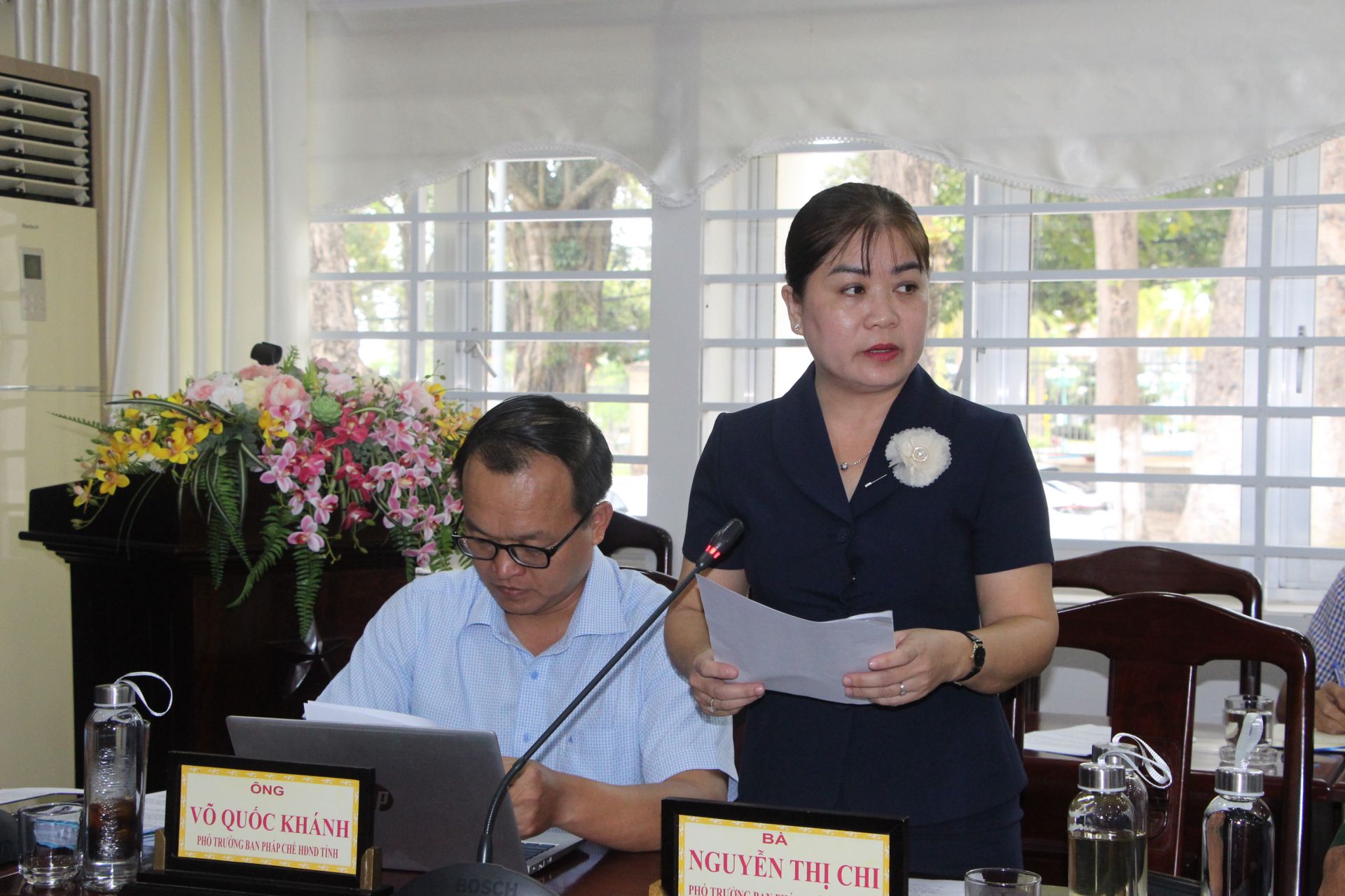 Bà Nguyễn Thị Chi - Phó trưởng Ban Pháp chế HĐND tỉnh phát biểu tại buổi thẩm tra.