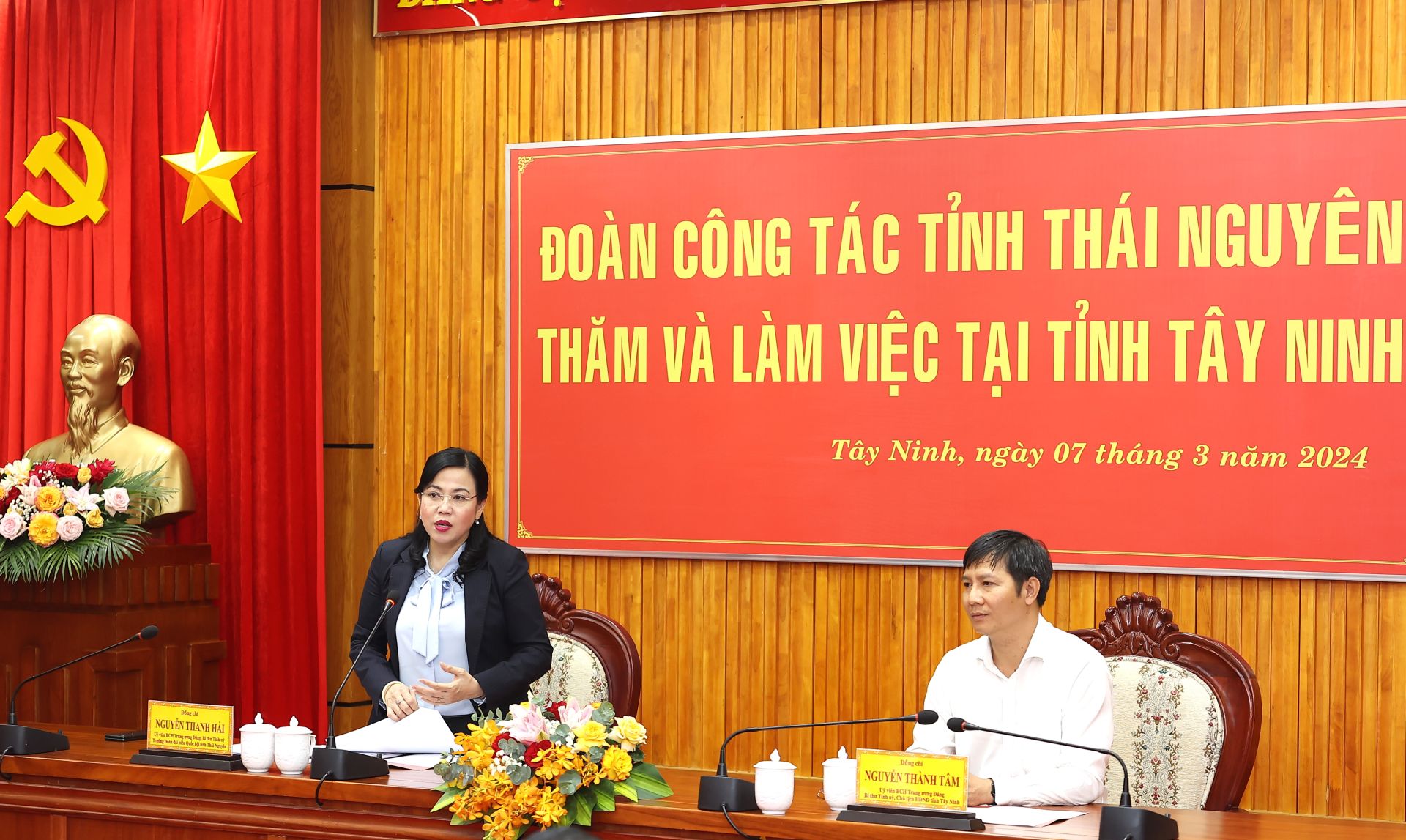 Ngày 7.3, đoàn công tác của tỉnh Thái Nguyên do bà Nguyễn Thanh Hải- Bí thư Tỉnh uỷ, trưởng đoàn đại biểu Quốc hội (ĐBQH) tỉnh Thái Nguyên làm trưởng đoàn có buổi làm việc với Ban Thường vụ Tỉnh uỷ Tây Ninh.
