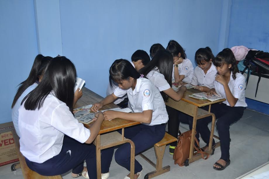 Các em học sinh đọc sách tại Thư viện Trung tâm VHTT-HTCĐ xã Hiệp Tân (huyện Hòa Thành). |