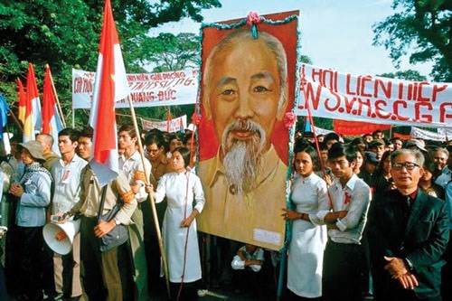 Nhân dân Sài Gòn-Gia Định mang theo ảnh Bác Hồ và băng cờ, khẩu hiệu tham dự mít tinh mừng chiến thắng, ngày 15.5.1975. Ảnh tư liệu.