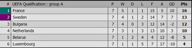 Bảng A: Belarus, Bulgaria, Pháp, Luxembourg, Hà Lan, Thụy Điển
