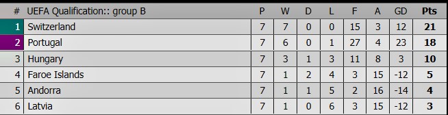 Bảng B: Andorra, Faroe Islands, Hungary, Latvia, Bồ Đào Nha, Thụy Sỹ