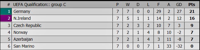 Bảng C: Azerbaijan, CH Séc, Đức, Bắc Ailen, Na Uy, San Marino
