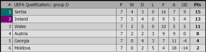 Bảng D: Áo, Georgia, Moldova, CH Ailen, Serbia, Xứ Wales