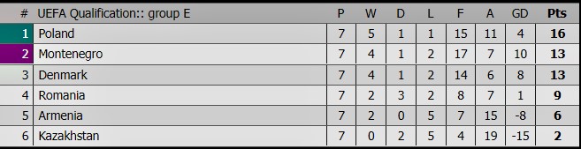 Bảng E: Armenia, Đan Mạch, Kazakhstan, Montenegro, Ba Lan, Romania