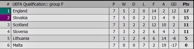 Bảng F: Anh, Lithuania, Malta, Scotland, Slovakia, Slovenia