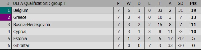 Bảng H: Bỉ, Bosnia-Herzegovina, Đảo Síp, Estonia, Gibraltar, Hy Lạp