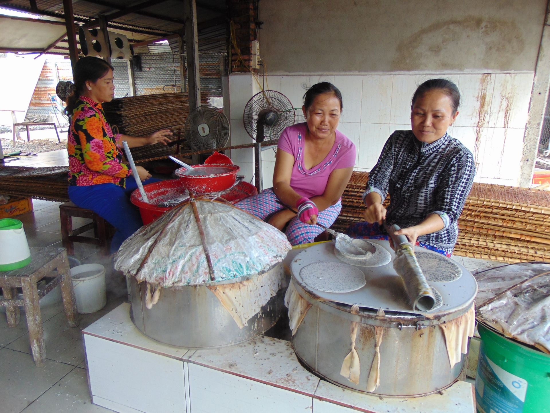 Anh kể, vài năm trước đã phải cất công ra tận Hải Dương học hỏi, mua về. Vậy mà vẫn phải nghiên cứu, cải tiến thêm để có chiếc máy bây giờ. Cỗ máy dài hơn 10m, nép bên một vách tường nhà. Nơi quan trọng nhất có tấm băng chuyền cuộn tròn lên nhờ hai trục ru- lô. Máy chạy trong làn hơi nước mịt mù, những tấm bánh tròn trịa hiện ra như phép lạ. Ở đầu cuối băng chuyền đã có những người phụ nữ xếp sẵn từng phên tre để đỡ từng chiếc bánh mới ra lò. Từng phên bánh ấy sẽ được bưng ra phơi trên giá đặt ngoài vườn hoặc dựa tường phơi ngoài con hẻm.