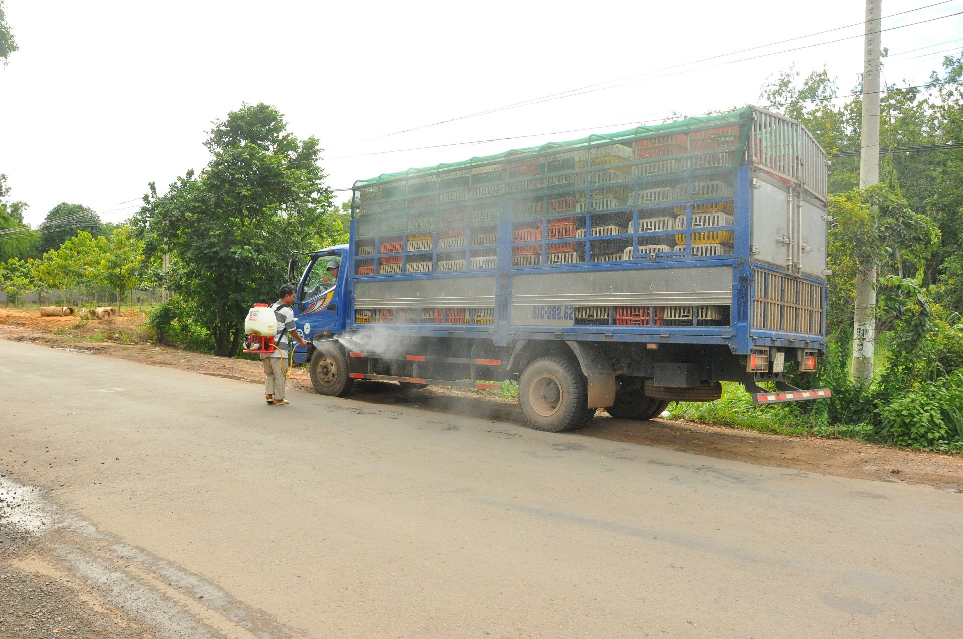 Phun thuốc sát trùng xe chuyên chở gia cầm.