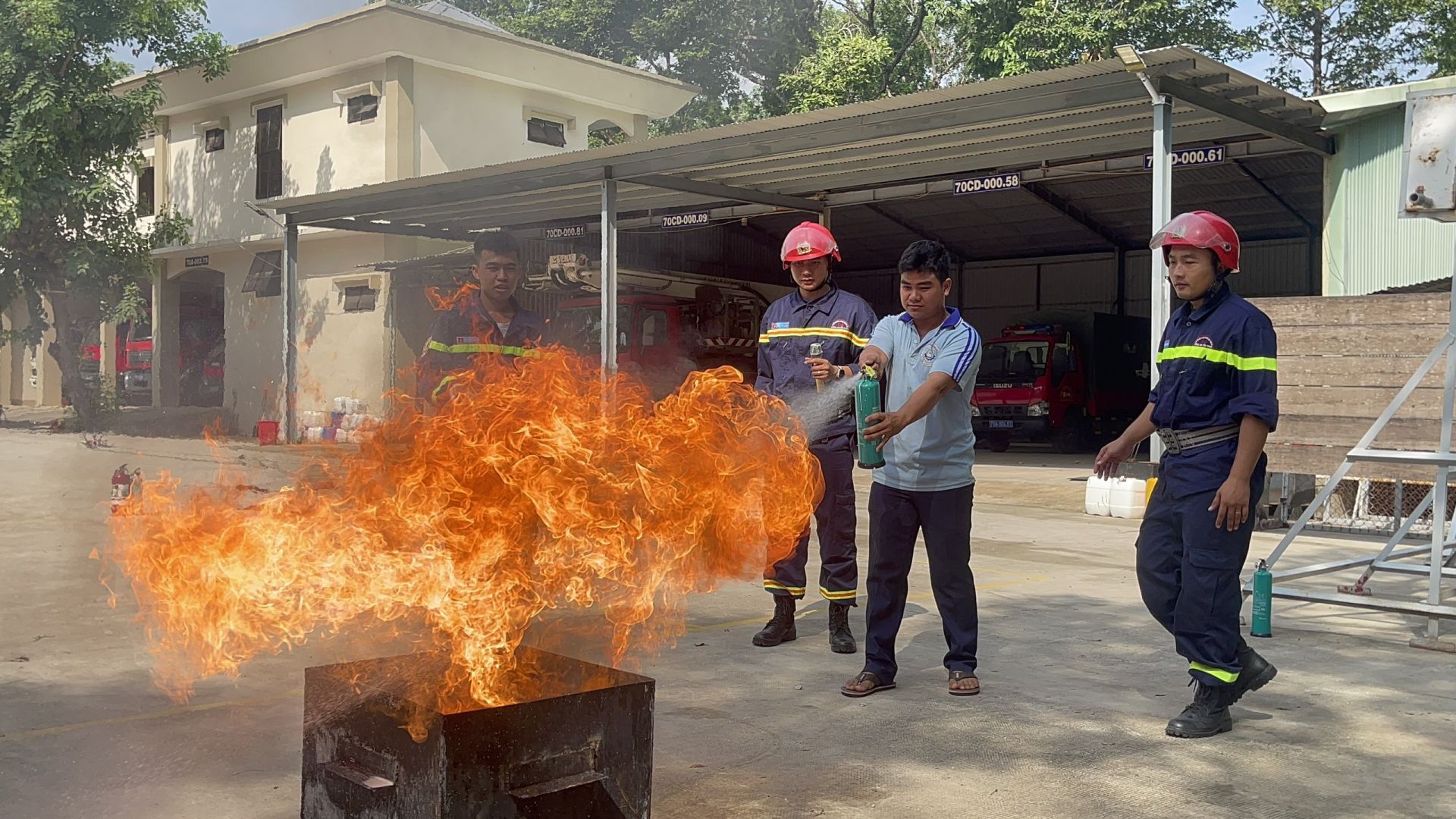 Lực lượng chức năng hướng dẫn kỹ năng dập tắt ngọn lửa.