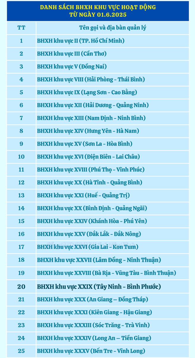 Bảo hiểm xã hội khu vực XXIX (Tây Ninh – Bình Phước) trong danh sách 25 bảo hiểm xã hội khu vực tạm thời chưa hoạt động theo tổ chức bộ máy mới từ ngày 1.4.2025.