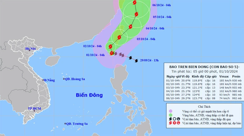 Hồi 4 giờ, vị trí tâm bão số 5 ở vào khoảng 20,6 độ vĩ bắc; 119,8 độ kinh đông, trên vùng biển phía Đông Bắc của khu vực bắc Biển Đông. Sức gió mạnh nhất vùng gần tâm bão mạnh cấp 16 (184-201km/giờ), giật trên cấp 17. Bão di chuyển theo hướng Tây Tây Bắc, tốc độ khoảng 5km/giờ.