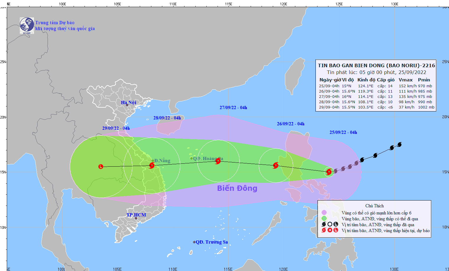 Sáng nay (25/9), bão Noru đã mạnh lên cấp 14, giật cấp 17, di chuyển rất nhanh, dự báo vào Biển Đông trong tối và đêm nay, sau đó di chuyển thần tốc vào các tỉnh miền Trung nước ta.