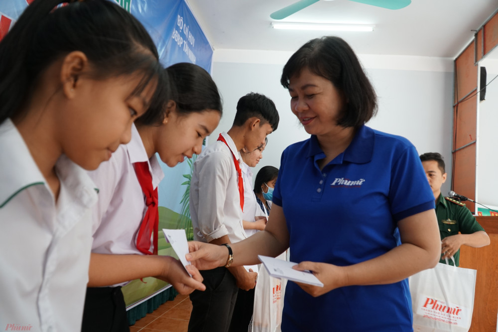 Bà Lý Việt Trung trao học bổng cho các em học sinh vùng biên có hoàn cảnh khó khăn.