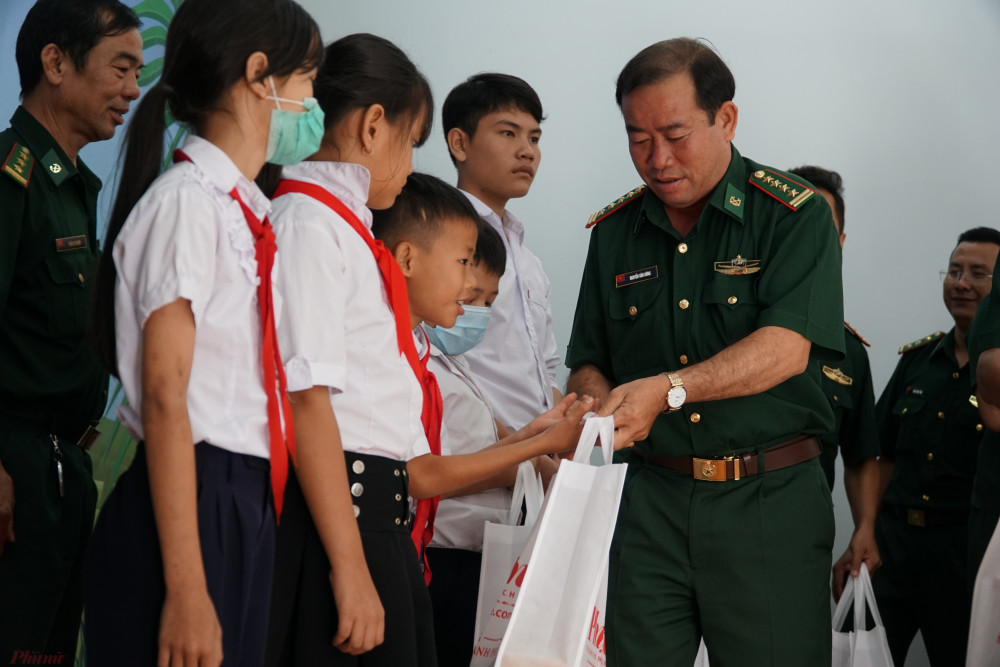 Đại tá Nguyễn Văn Dũng trao học bổng và phần quà của Báo Phụ Nữ TPHCM đến các em học sinh.