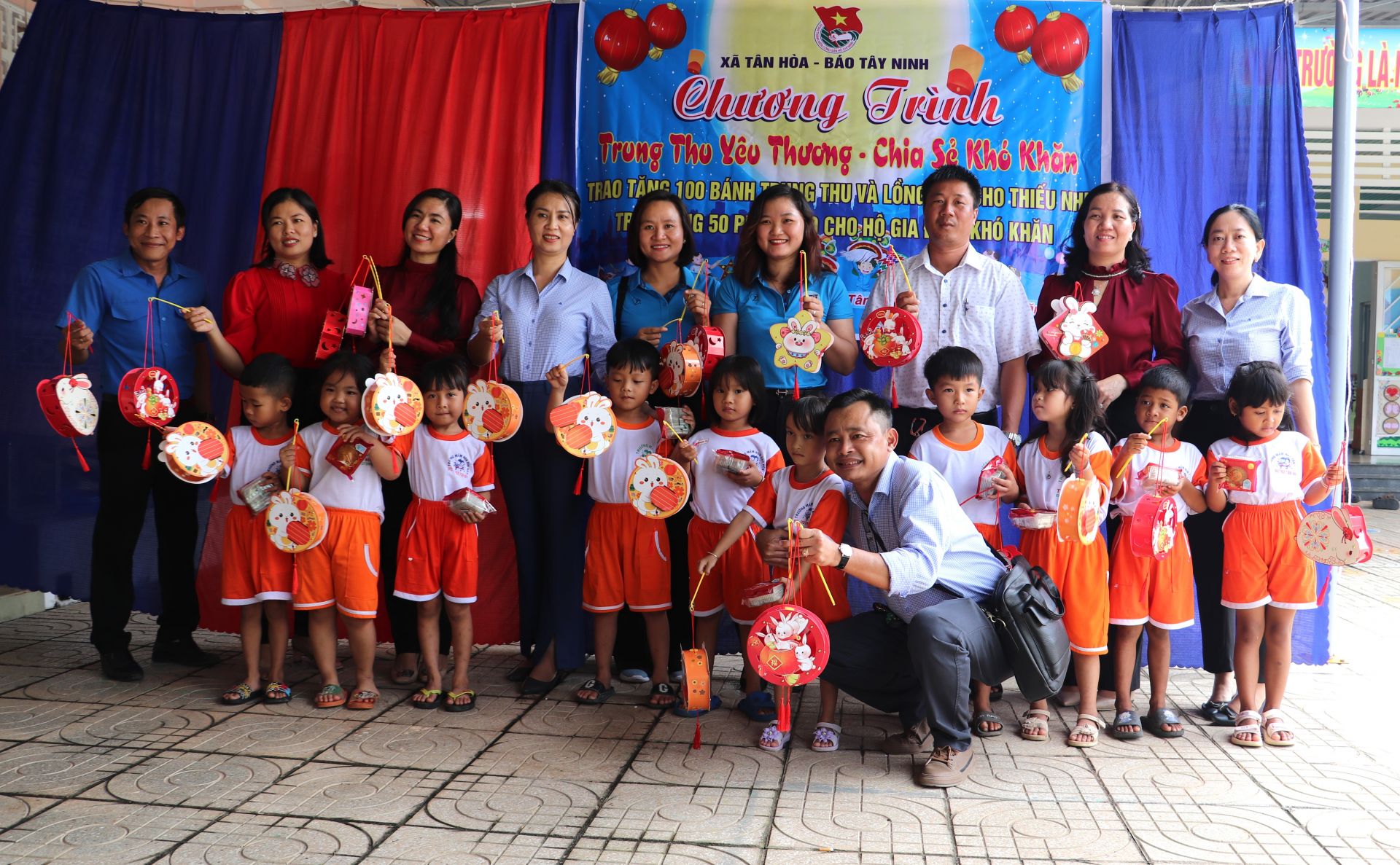 Đại diện Công đoàn và Chi đoàn Báo Tây Ninh trao tặng 100 phần bánh trung thu và lồng đèn đến các em thiếu nhi; đồng thời trao tặng 50 phần quà cho các hộ gia đình có hoàn cảnh khó khăn, mỗi phần gồm 20kg gạo.