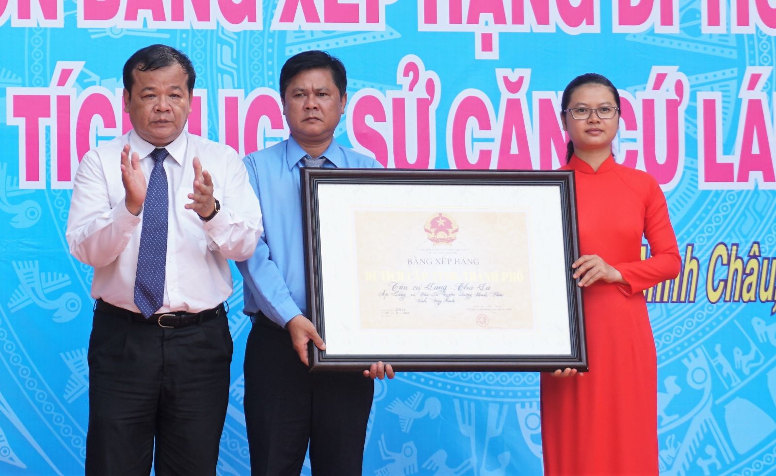 Chủ tịch UBND tỉnh Tây Ninh Phạm Văn Tân trao bằng xếp hạng di tích cấp tỉnh cho lãnh đạo xã Chà Là.