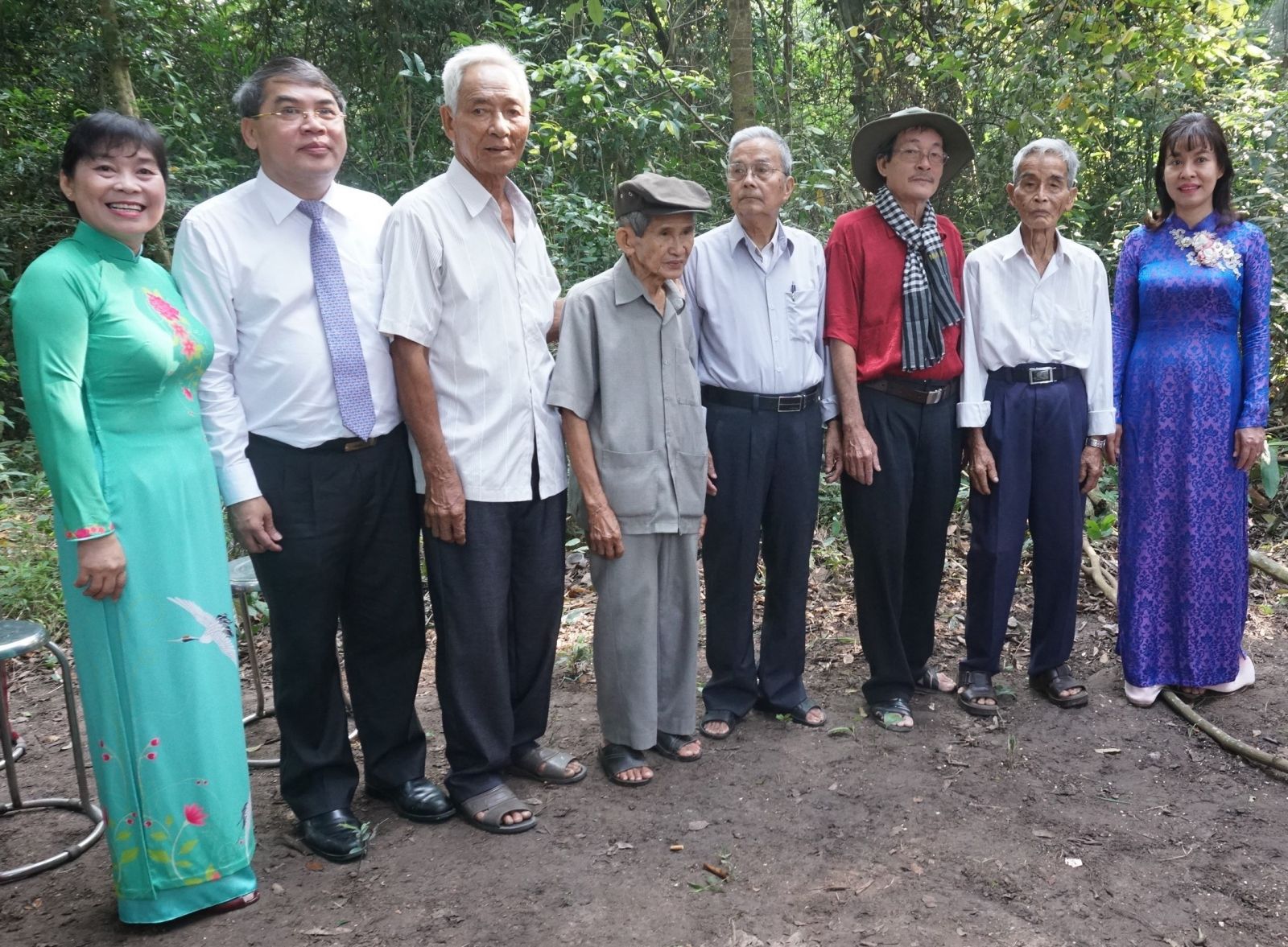Lãnh đạo tỉnh, huyện và một số cán bộ cách mạng lão thành chụp ảnh lưu niệm trước Căn cứ Láng - Chà Là.