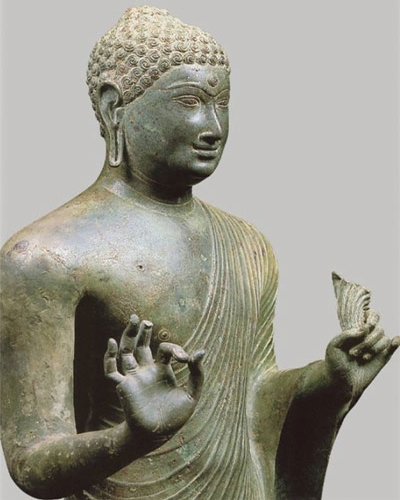 Khuôn mặt Đức Phật tròn đầy đặn, đôi tai dài và mắt sâu, cổ ba ngấn. Vai phải để trần, áo từ vai trái rũ xuống theo kiểu nam thần Yaksha, thân dưới mặc Antariya dài tới mắt cá chân.