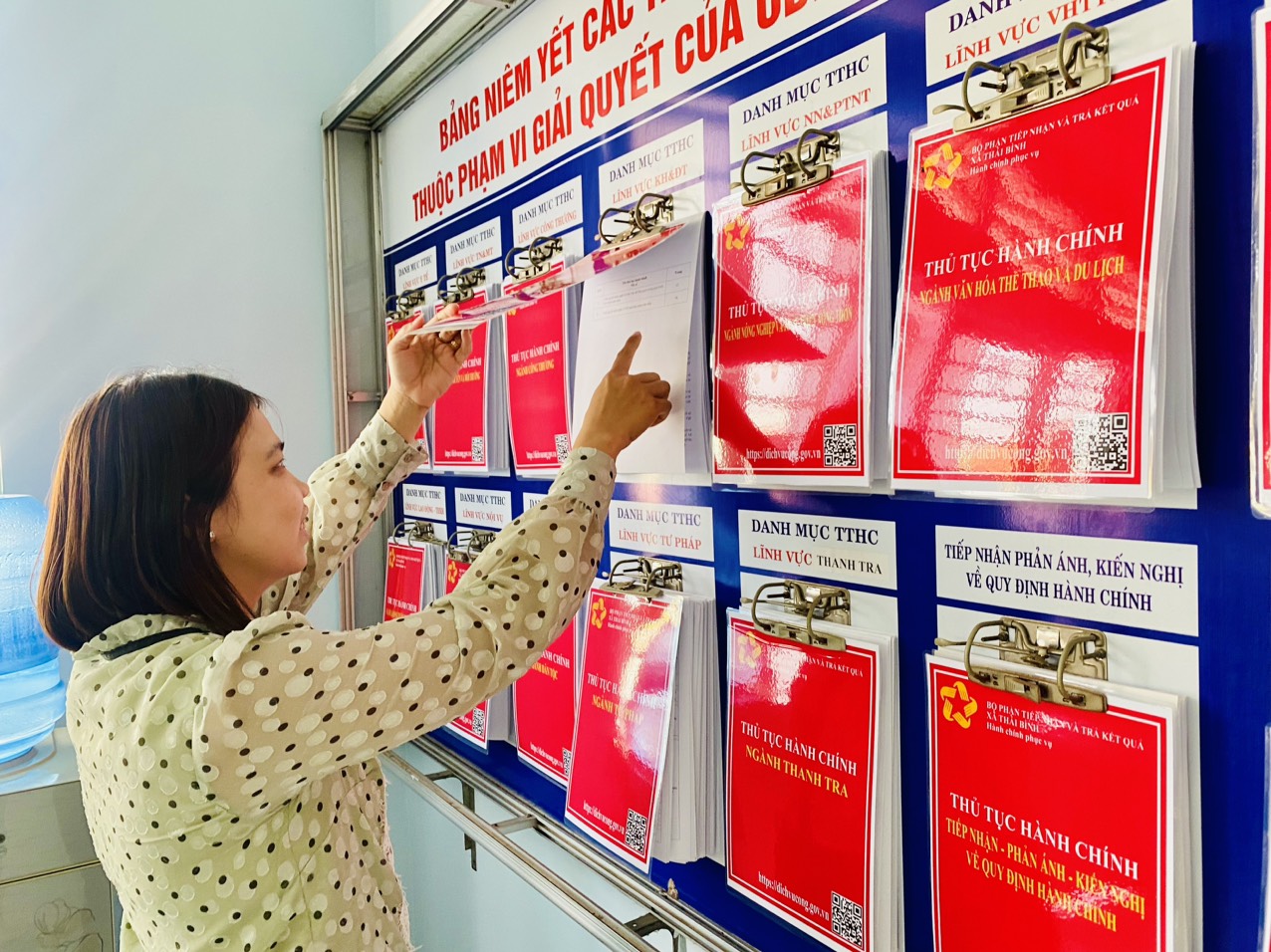 Người dân tìm hiểu các văn bản tại bảng niêm yết thủ tục hành chính tại bộ phận “Một cửa”.