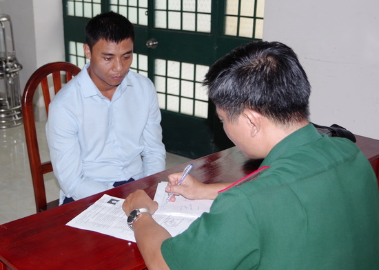Cán bộ Đồn BP Mộc Bài lấy lời khai đối tượng Nguyễn Mạnh Hiền.