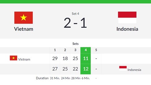 10h34’: ĐT bóng chuyền nữ Việt Nam giành chiến thắng 25-22 trước chủ nhà Indonesia trong set 3. Tỷ số là 2-1 cho thầy trò HLV Nguyễn Tuấn Kiệt.