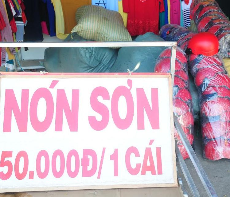 Cách đó không xa, trong một cửa hàng bán quần áo, bà Nga đang bày bán 200 chiếc mũ thành phẩm được quảng cáo là "Nón Sơn"- một thương hiệu sản xuất mũ bảo hiểm nổi tiếng, với giá 50.000 đồng/cái. Trên các nón đều có dán tem hợp quy- CR.