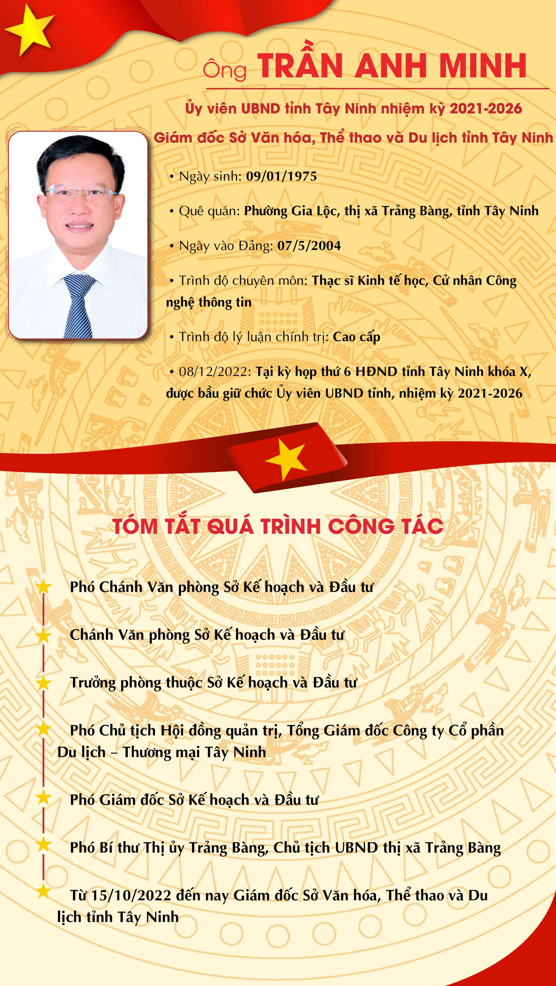 Ông Trần Anh Minh sinh ngày 9.1.1975; quê quán phường Gia Lộc, thị xã Trảng Bàng; ngày vào Đảng dự bị 7.5.2004, ngày vào Đảng chính thức 7.5.2005; trình độ lý luận chính trị: cao cấp; chuyên môn nghiệp vụ: Thạc sĩ kinh tế học, cử nhân công nghệ thông tin.