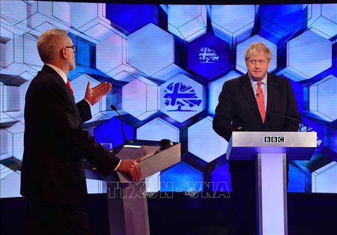 Thủ tướng Boris Johnson (phải) và lãnh đạo Công đảng đối lập Jeremy Corbyn (trái) tại vòng tranh luận trực tiếp cuối cùng trên sóng truyền hình ở London, Anh, ngày 6/12/2019. Ảnh: AFP/TTXVN