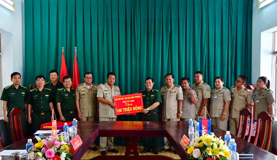 BĐBP tỉnh Tây Ninh đã trao tặng số tiền 100 triệu đồng hỗ trợ Tiểu đoàn Cảnh sát bảo vệ biên giới 611 thuộc Ty Cảnh sát tỉnh Svay Rieng để xây dựng doanh trại.