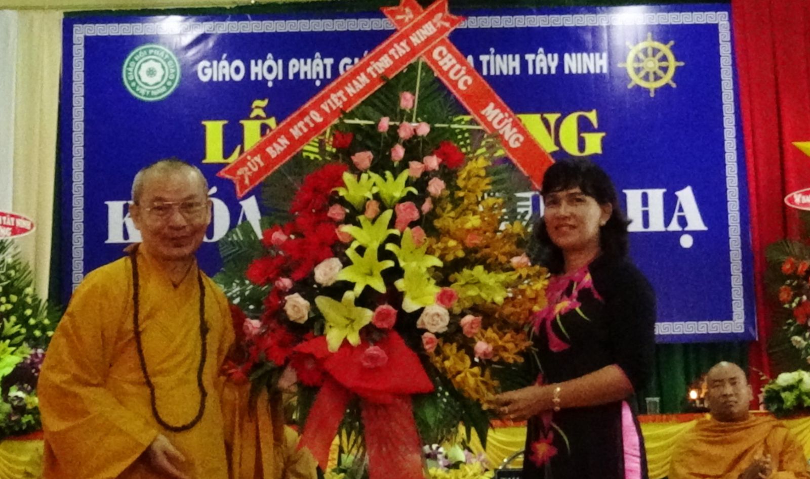 Bà Đặng Minh Luỹ- Phó Chủ tịch UB.MTTQVN tỉnh tặng hoa chúc mừng lễ bế giảng khóa An cư kiết hạ của Giáo hội Phật giáo tỉnh Tây Ninh.