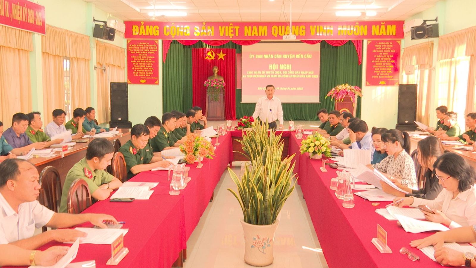 Hội nghị đã thảo luận, thống nhất chốt danh sách quân số công dân huyện Bến Cầu nhập ngũ và thực hiện nghĩa vụ tham gia Công an nhân dân năm 2025 là 155 công dân. Theo đó, huyện sẽ giao về cho các đơn vị: Bộ Chỉ huy Bộ đội biên phòng tỉnh 50 công dân; Trung đoàn 174, Bộ Chỉ huy Quân sự tỉnh 20 công dân; Trung đoàn 5, Sư Đoàn bộ binh 5 là 33 công dân; Lữ Đoàn 98, Cục Tác chiến điện tử 10 công dân; Tiểu đoàn vệ binh 180, Bộ Tham mưu Quân khu 7 là 2 công dân và Công an tỉnh 40 công dân. Trong số đó, có 3 công dân nhập ngũ là đảng viên, chiếm 2,6%.