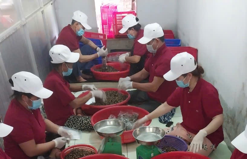 Các lao động giúp gia đình anh Tánh tạo ra sản phẩm dế thành phẩm đi tiêu thụ.