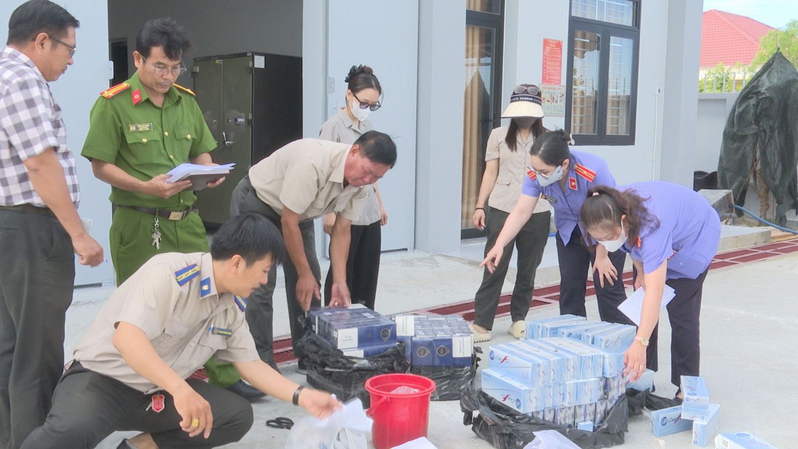Các tang vật, vật chứng này thuộc 5 bản án về tội “Tàng trữ trái phép chất ma tuý”; 12 bản án về tội “Tổ chức sử dụng trái phép chất ma tuý”; 2 bản án về tội “Trộm cắp”, 1 bản án về tội “Tổ chức đánh bạc”, 1 bản án về tội “Gây rối trật tự công cộng”, 3 bản án về tội “Vi phạm quy định bảo vệ động vật nguy cấp quý, hiếm” và 1 bản án về tội “Vận chuyển hàng cấm” với 1.600 gói thuốc lá ngoại nhãn hiệu 555 và Camfly.