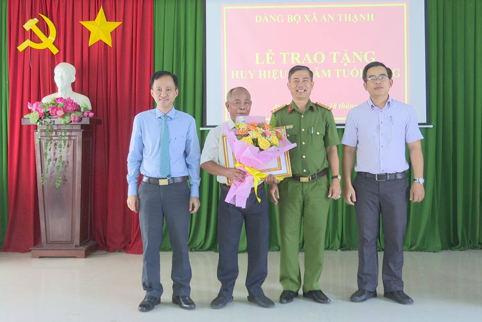 Ông Nguyễn Tuấn Khanh- Phó Bí thư Thường trực Huyện uỷ Bến Cầu trao Huy hiệu 50 năm tuổi Đảng cho viên đảng thuộc Đảng bộ xã An Thạnh.
