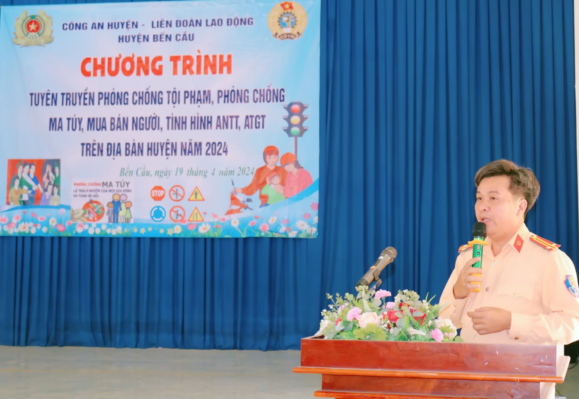 Ngày 19.4, Liên đoàn Lao động huyện Bến Cầu phối hợp Công an huyện tổ chức chương trình tuyên truyền phòng chống tội phạm, phòng chống ma tuý, mua bán người, an ninh trật tự, an toàn giao thông cho cán bộ, đoàn viên, người lao động các tổ chức công đoàn cơ sở trên địa bàn huyện.