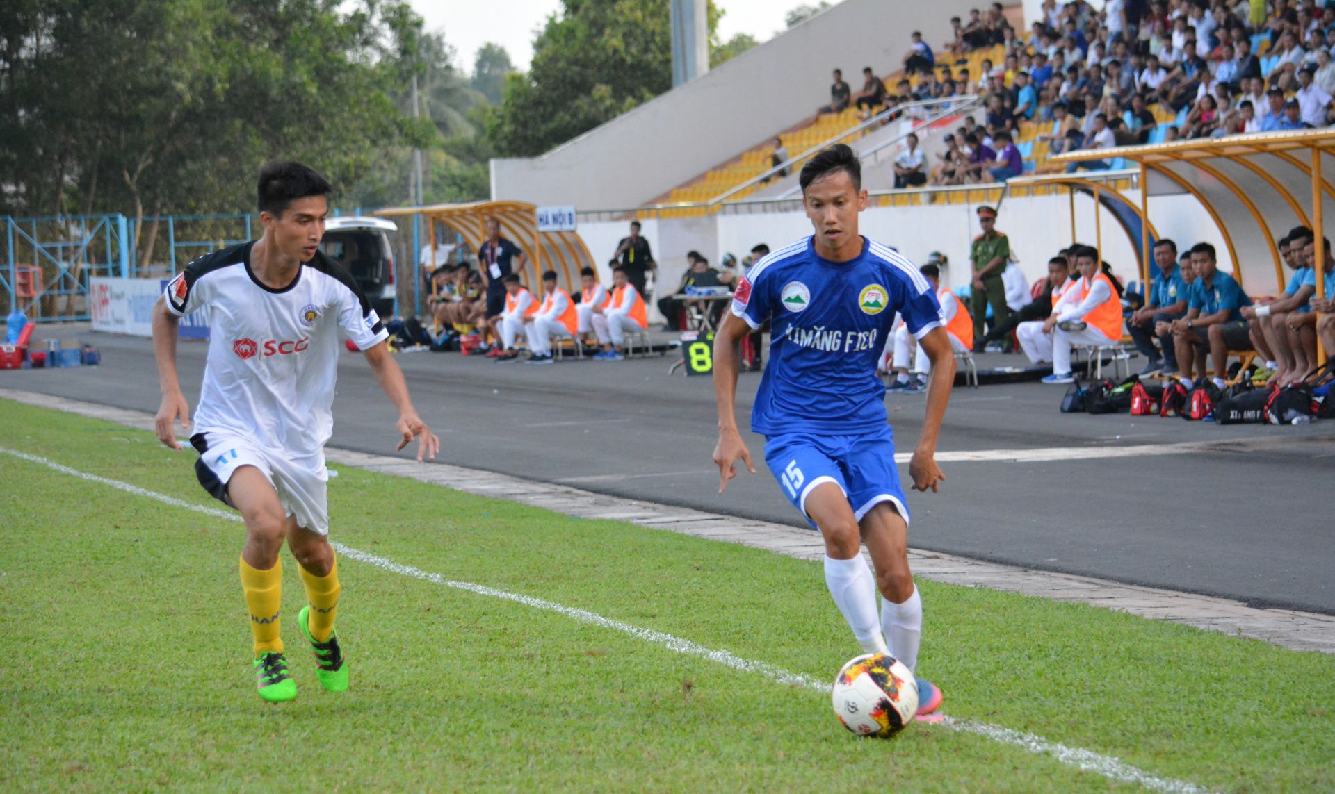 Lâm Văn Ngoan (bên phải) thi đấu rất nhiệt tình trong màu áo quê hương.