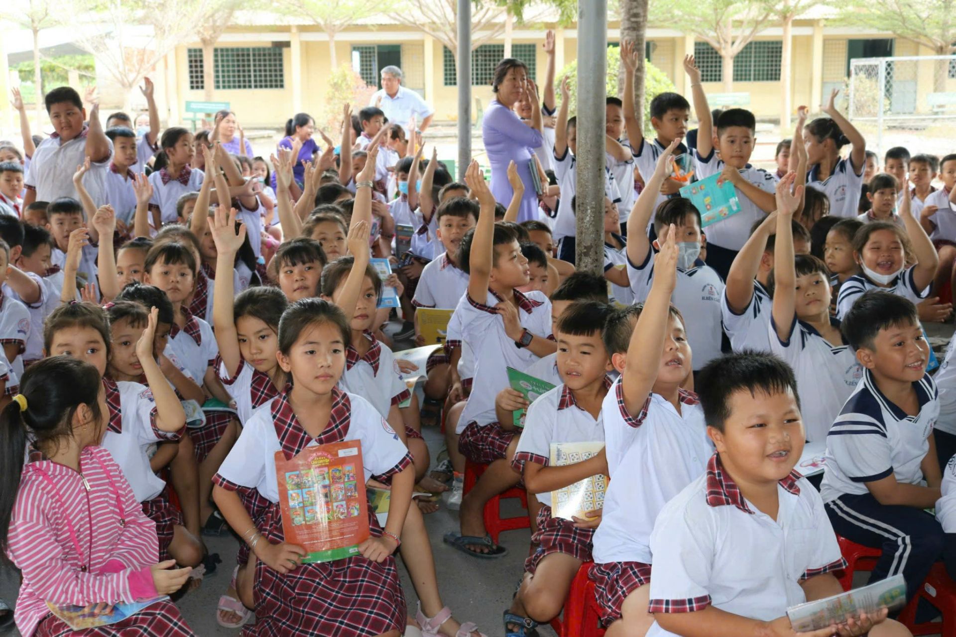 Các em trường Tiểu học thị trấn Bến Cầu tham gia chương trình phục vụ sách lưu động.