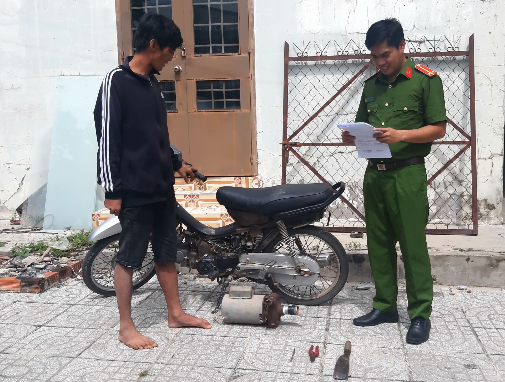 Đối tượng bị bắt tên Nguyễn Văn Phong (sinh 1987, ngụ ấp Voi, xã An Thạnh, huyện Bến Cầu) khai nhận, đã bàn bạc cùng đối tượng Trần Văn Giỏi (sinh 1991, ngụ ấp Ngã Tắc, xã Long Thuận, huyện Bến Cầu), chạy thoát, đã lẻn vào nhà người dân ở xã Tiên Thuận trộm moteur, đang trên đường đi bán để kiếm tiền mua ma tuý, thì bị chặn bắt. Kiểm tra nhanh với ma túy, đối tượng Phong dương tính với chất ma tuý.