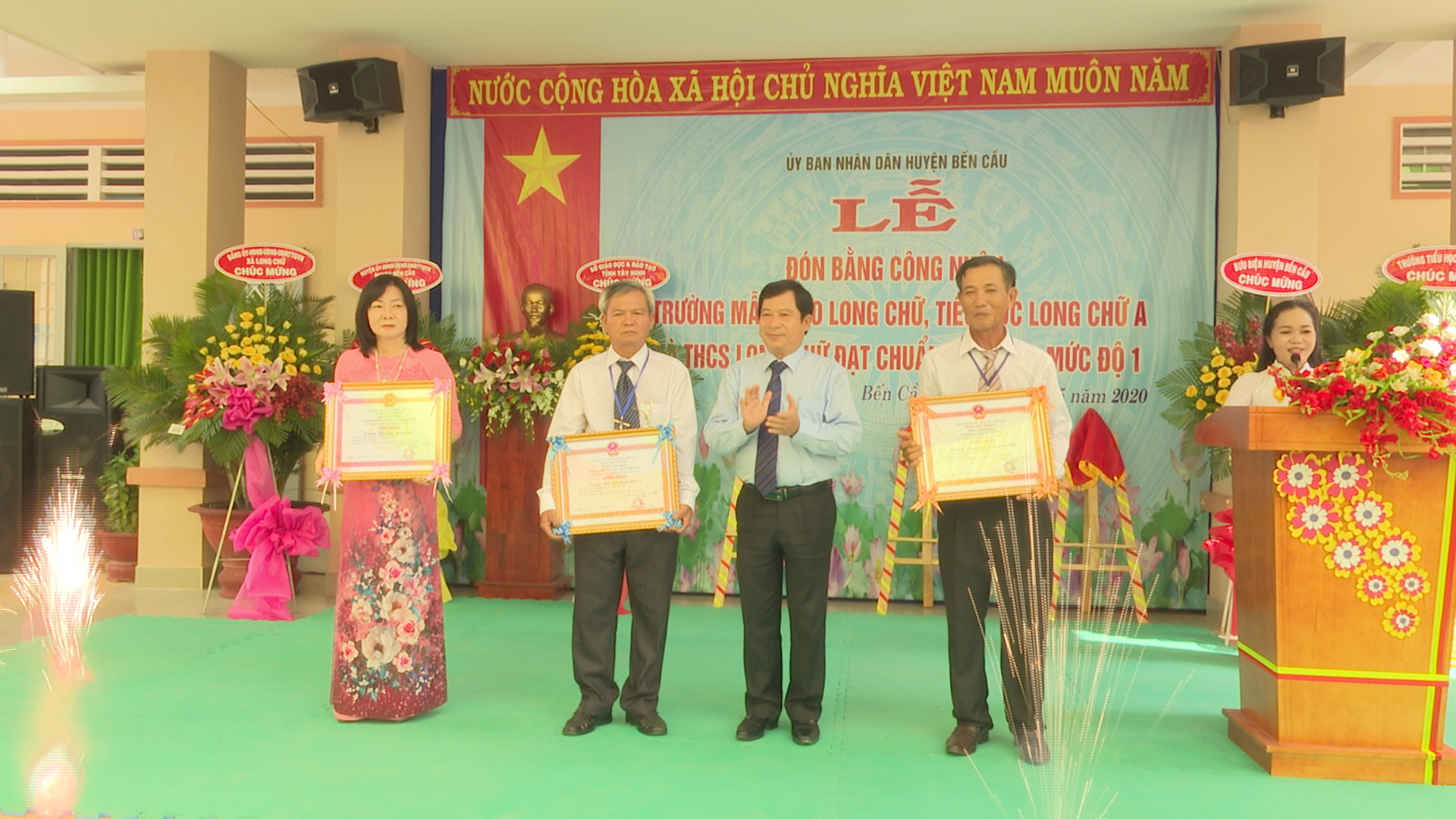 Hôm 30.5, tại Trường Tiểu học Long Chữ A (xã Long Chữ), UBND huyện Bến Cầu tổ chức lễ đón nhận Bằng công nhận đạt chuẩn Quốc gia mức độ I của 3 trường Mẫu giáo Long Chữ, Tiểu học Long Chữ A và THCS Long Chữ.