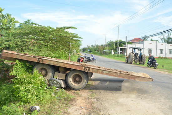 Vào giờ nói trên, chiếc máy cày không biển số kéo theo rơ-mooc cũng không có biển số do tài xế Vương Tấn Đạt (21 tuổi, ngụ ấp Long Tân, xã Long Giang) điều khiển lưu thông từ hướng xã Long Giang về Long Phước, khi đến địa điểm trên thì bất ngờ chiếc rơ-mooc bị sút ra, văng sang bên kia đường.