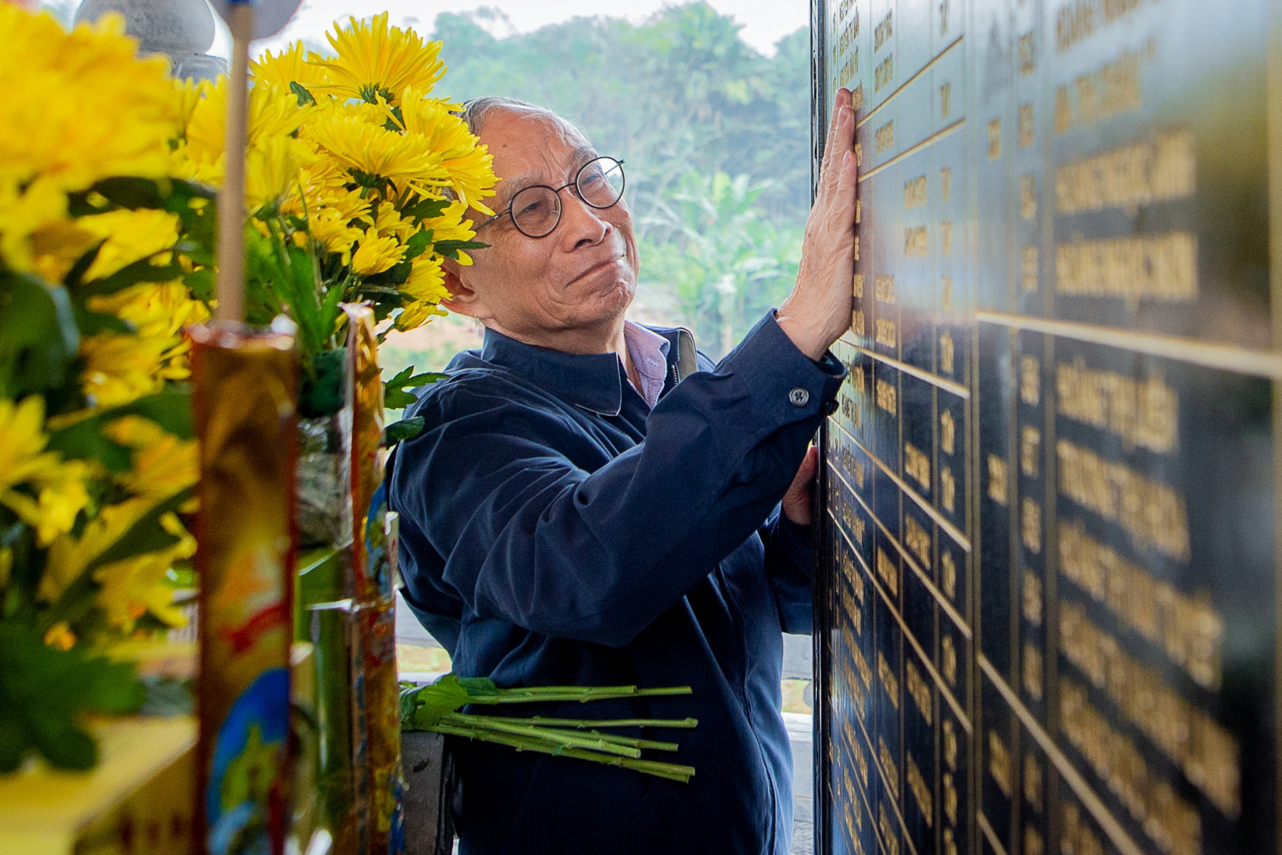 Thầy Nguyễn Xuân Khang xúc động khi nhìn tấm bảng ghi tên những người dân Làng Nủ bị thiệt mạng trong trận lũ.