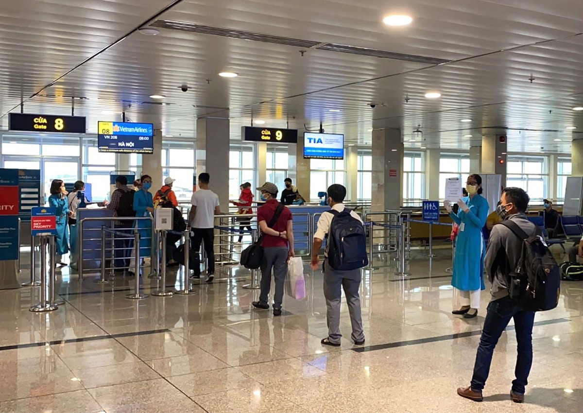 Tại sân bay Nội Bài, hành khách xếp hàng làm thủ tục và ra cửa máy bay được yêu cầu đứng cách nhau 2 m. Khách cũng được đo thân nhiệt, yêu cầu khai y tế. Xe đưa khách ra máy bay chỉ chở tối đa 40 người. Trên máy bay, hành khách được xếp ngồi cách xa nhau một hàng ghế.