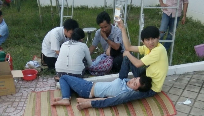 Các công nhân ngộ độc nằm la liệt trong khu công nghiệp - Ảnh: Bửu Đấu