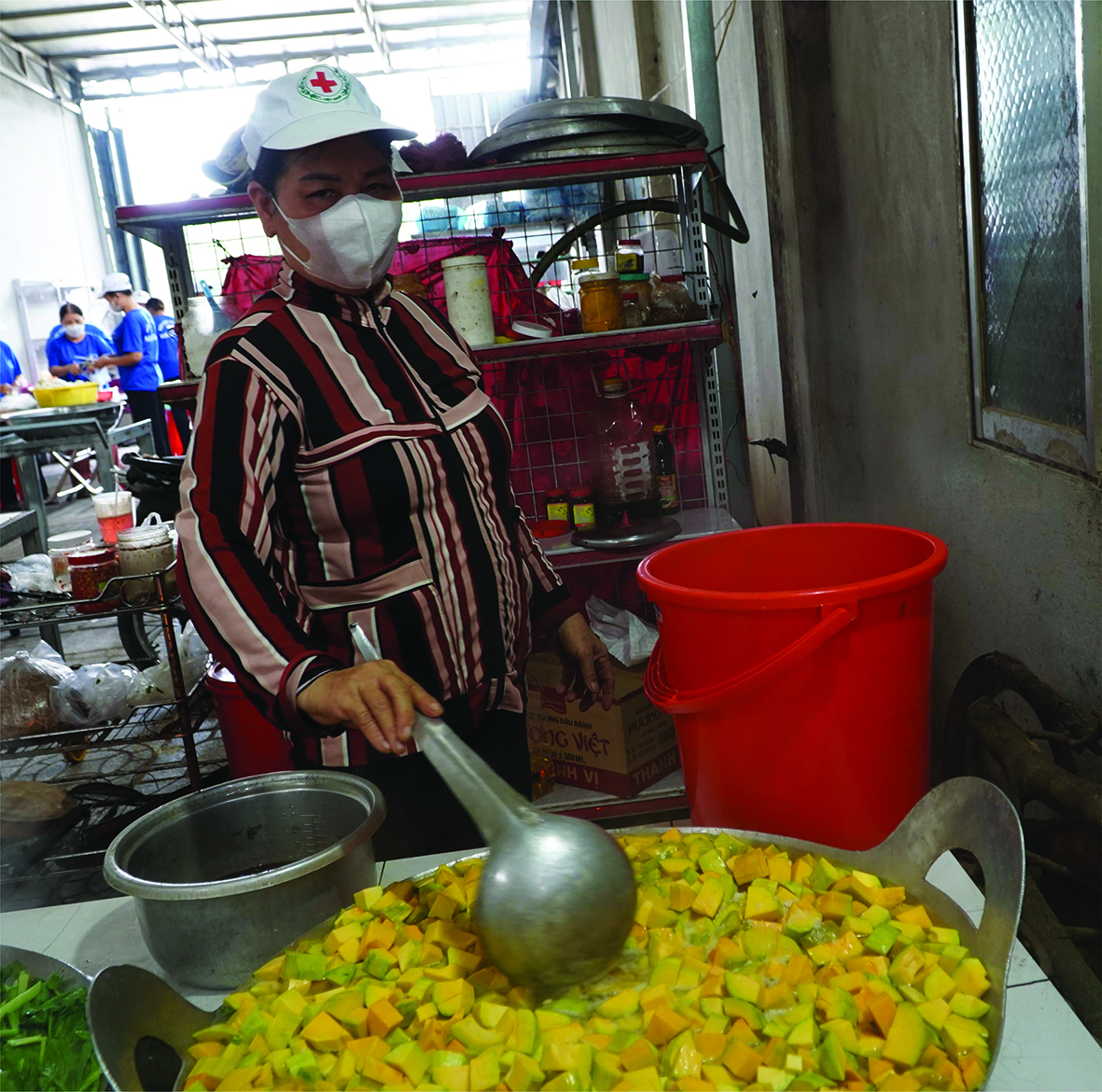 Theo chị Nhã, nhiều năm trước chị tham gia nấu bếp ăn từ thiện do một người quen lập nên và thuê địa điểm để làm bếp. Lúc đó, chị là bếp chính. Đến khi chủ đất không cho thuê tiếp thì bếp dời về trên đất nhà chị. Để bếp tiếp tục “đỏ lửa”, chị Nhã đứng ra quán xuyến mọi việc- từ hướng dẫn công việc cho mọi người đến kiểm kê nguyên vật liệu, vận động mỗi khi thiếu thực phẩm. Chị nói: “Lúc đầu bếp có nguy cơ giải tán vì không có mặt bằng hoạt động, tôi cứ tiếc công gầy dựng. Được sự động viên của chị em, tôi quyết định mang bếp về phần đất nhà mình. Được mọi người tiếp tục quan tâm hỗ trợ, đến nay, bếp đã khang trang, cơ sở vật chất bảo đảm để nấu hàng trăm suất cơm chay mỗi ngày”. Lúc mang bếp về hoạt động, chỉ có khoảng 4 chị em đồng hành nhưng đến nay con số này đã lên đến khoảng 30 người- là những chị em trên địa bàn phường.